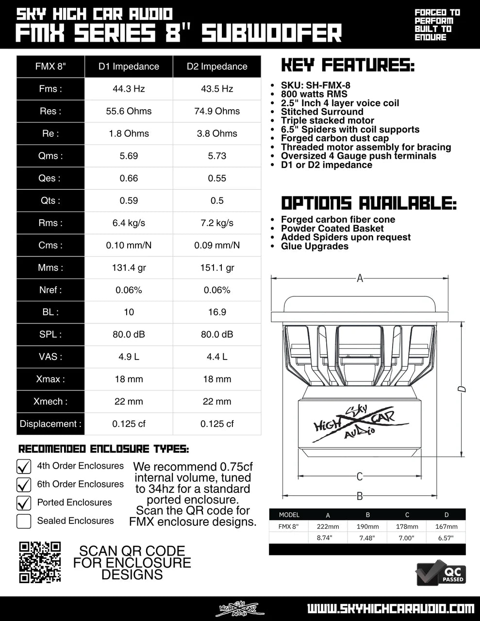 The FMX Series 6.5” features a 600W RMS rating, driven by a 2” high-temp coil, and stabilized by a 5.5” progressive spider. It’s equipped with Sky High 10-gauge direct leads, ensuring clean power transfer and reliable long-term use. Despite its small size, the 6.5” FMX hits with control and depth, making it ideal for tight spaces or multi-driver setups where output and efficiency matter.